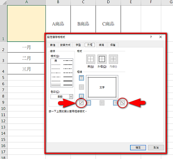 2.接著會出現「設定儲存格格式」的視窗,可選擇對角線的方向(如下圖箭頭所指處):