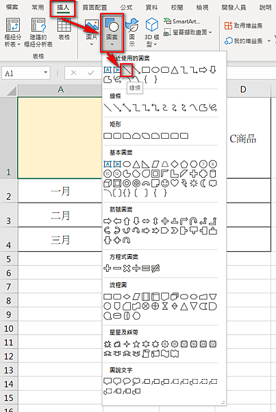 1.選擇工具列上的「插入」->「圖案」->「線條」: