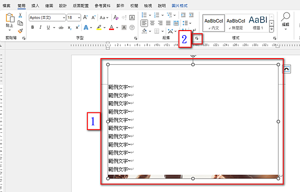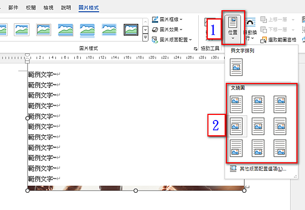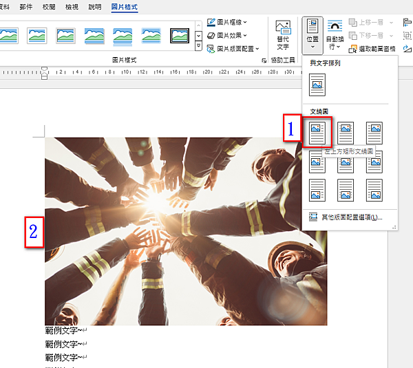 3.示範點選「左上方矩形文繞圖」(如下圖紅框1),圖片就會在左上方完整顯示圖片: