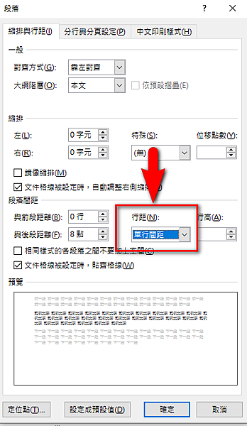 2.接著會出現「段落」的視窗,請將「行距」改為「單行間距」,然後按下「確定」: