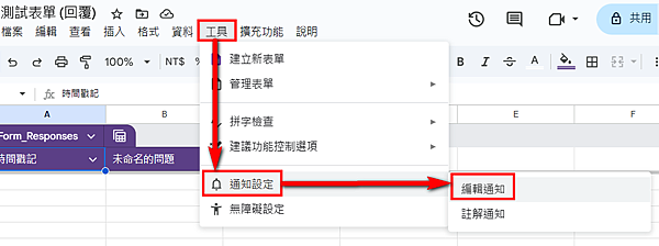3.開啟該試算表後,點選上方工具列,點選「工具」->「通知設定」->「編輯通知」: