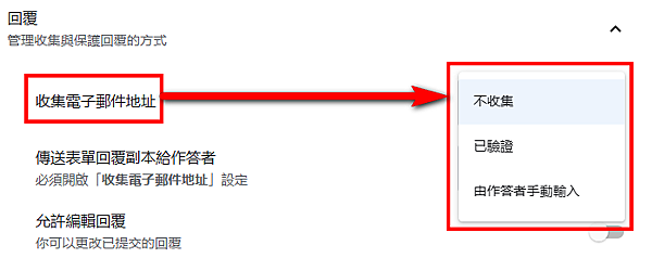 4.「回覆」項下的「收集電子郵件地址」中,可以選擇「不收集」、「已驗證」或「由作答者手動輸入」,請點選「由作答者手動輸入」: