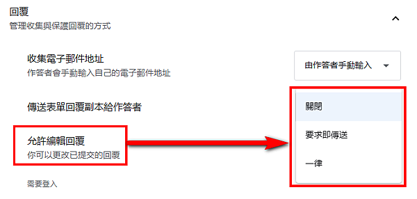 5.「回覆」項下的「允許編輯回覆」中,可以選擇「關閉」、「要求即傳送」或「一律」,請點選「一律」: