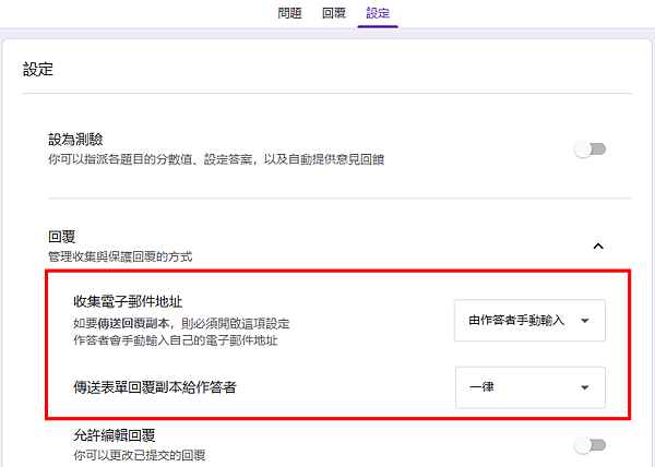 1.點選上方的「設定」->「回覆」->「收集電子郵件地址」,可以選擇「已驗證」或「由作答者手動輸入」,以便紀錄填寫者的信箱: