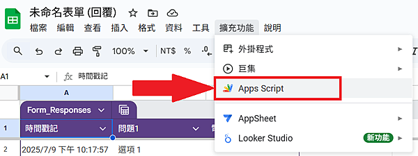 2.開啟表單對應的試算表回應頁面,點選工具列的「擴充功能」→「Apps Script」: