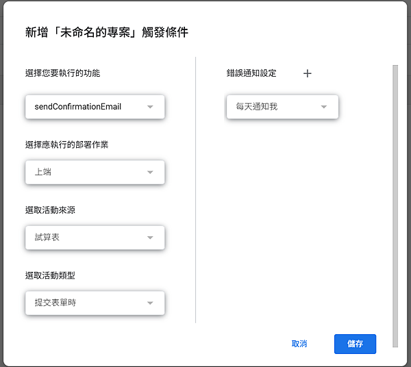 5.接著請點選左邊工具列的「觸發條件」(鬧鐘符號),並依需求設定相關條件(例如:「選取活動來源」設定「試算表」、「選取活動類型」設定「提交表單時」),讓這段程式在每次表單提交後自動執行。
