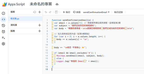 4.輸入寄送信件的程式(在回應送出後觸發程式寄信給填表者)後,按下上方的存檔按鈕: