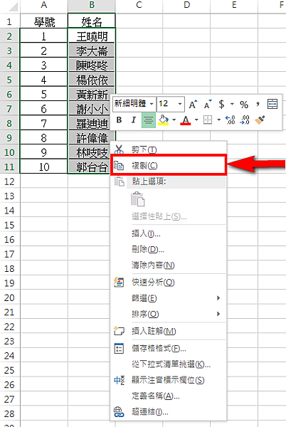1.全選要分別建立資料夾的清單名稱,接著請按滑鼠右鍵,點選「複製」: