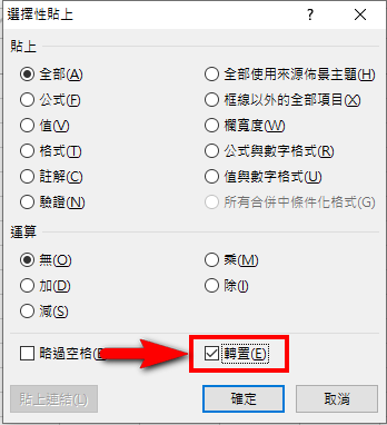 3.接著會出現「選擇性貼上」的視窗,請勾選「轉置」後,按下「確定」:
