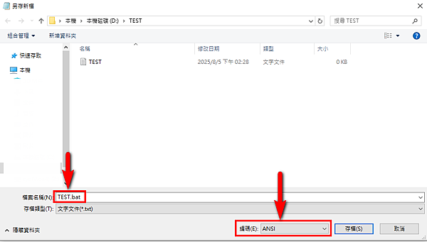 7.請另存新檔,檔案名稱末端請加上「.bat」、編碼請選「ANSI」,接著請按「存檔」: